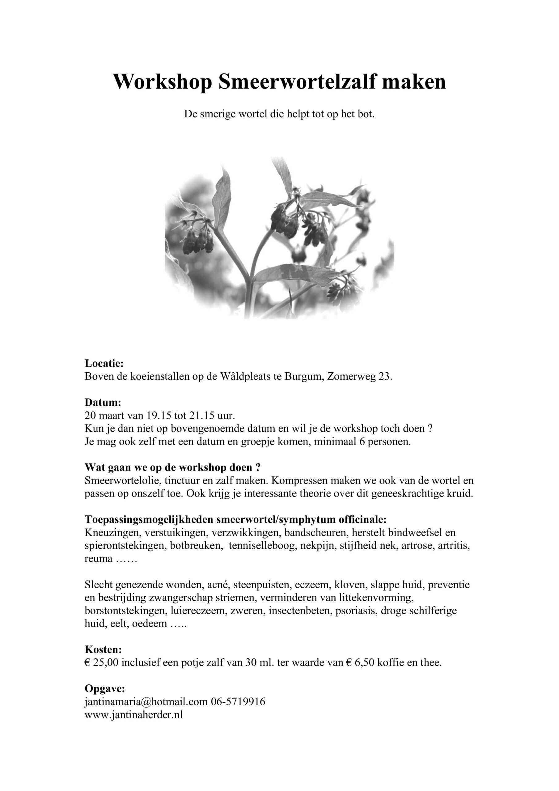 De workshop smeerwortel zalf maken is al geweest, maar als je zelf met een groepje komt van minimaal 6 personen doe ik hem graag nog een keer. Ik kom ook op locatie.