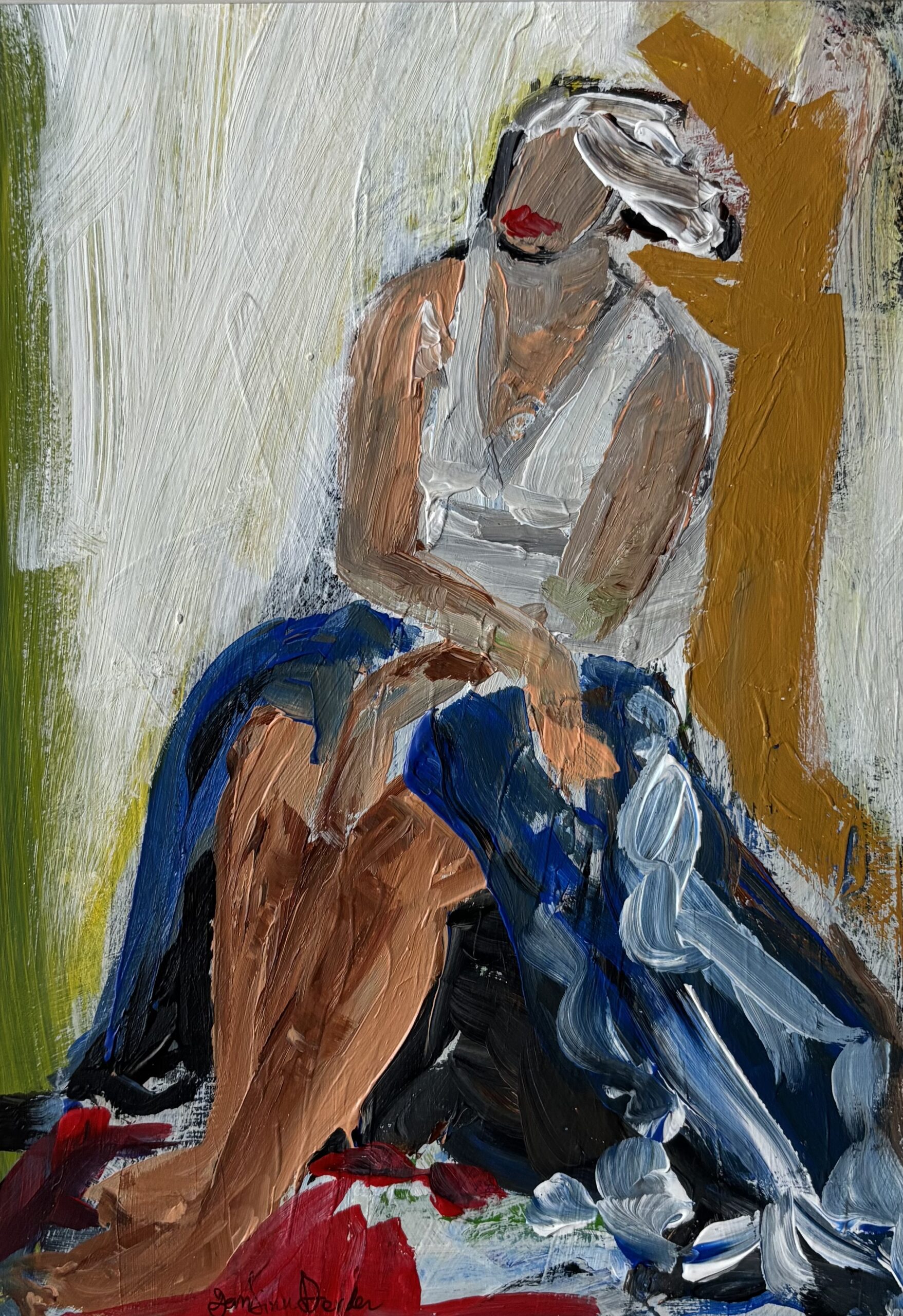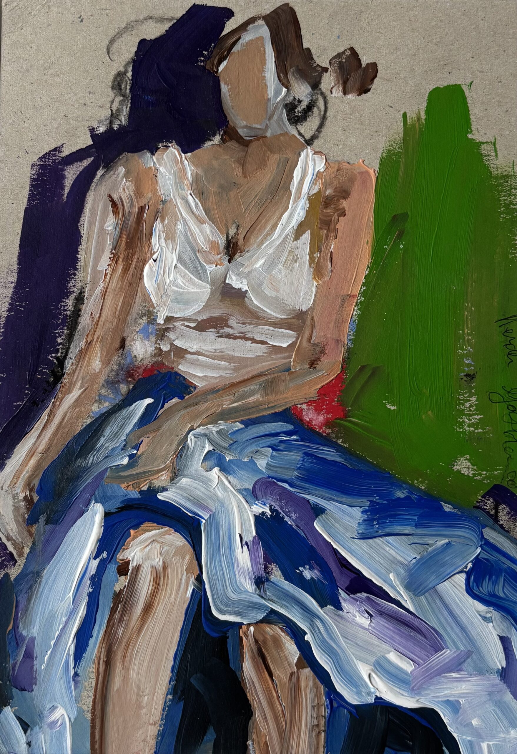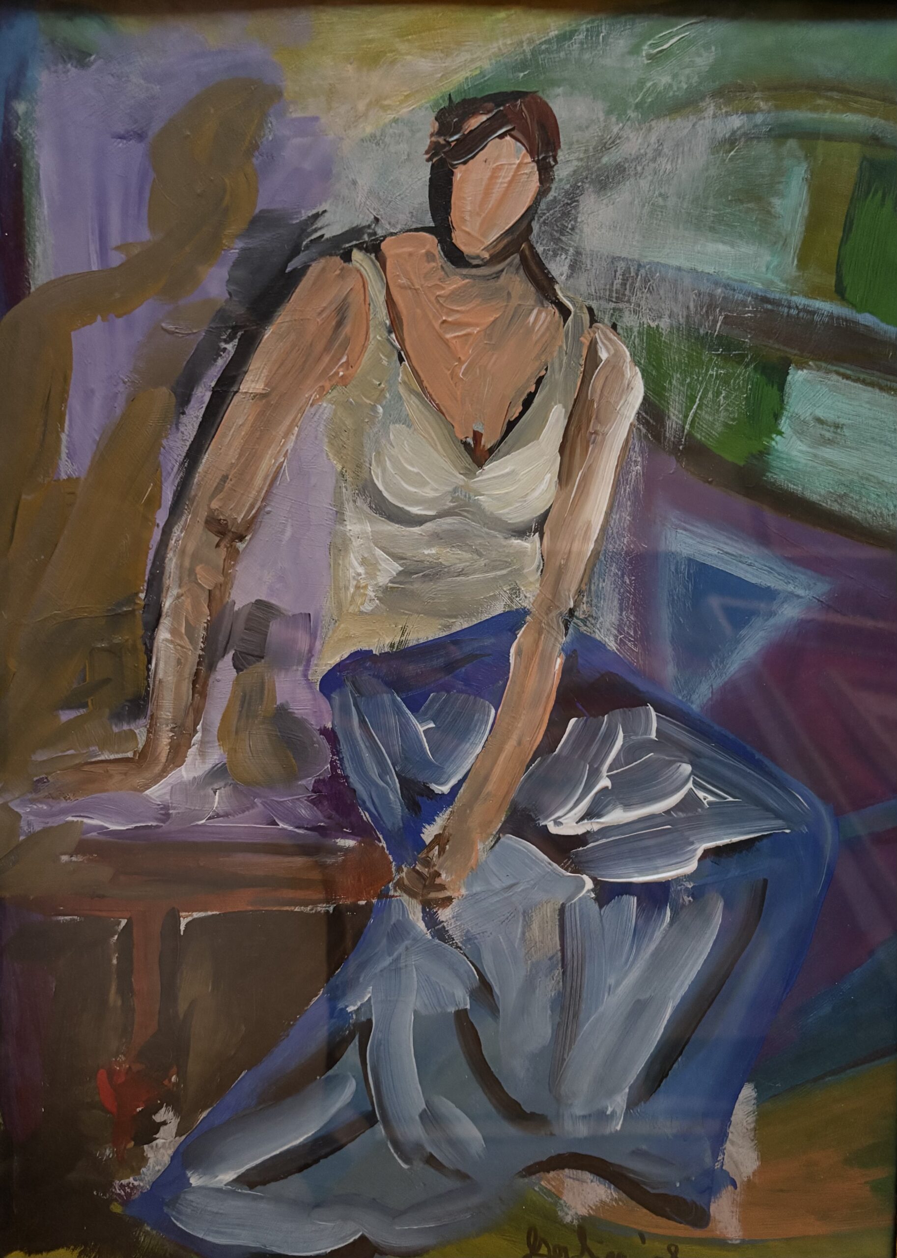 Een abstract schilderij van een zittende vrouw, geschilderd met grove penseelstreken en een expressief kleurgebruik. Het werk is een moderne interpretatie van het menselijk figuur, waarbij de focus ligt op de emotie en de beweging (Ingelijst 30/40 cm. Acrylverf op stevig papier) Uit serie van 4. Per stuk incl. lijst € 150,00 Per vier € 500,00